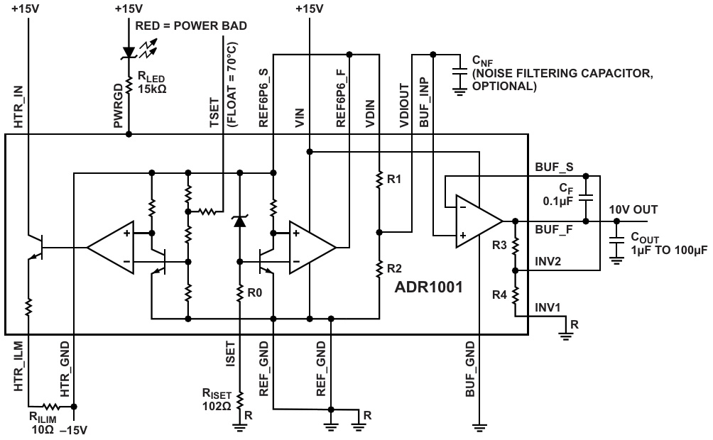 The block diagram of the Analog Devices ADR1001 precision voltage reference, including surrounding schematic, shows split-supply heater operation and 10-V reference output