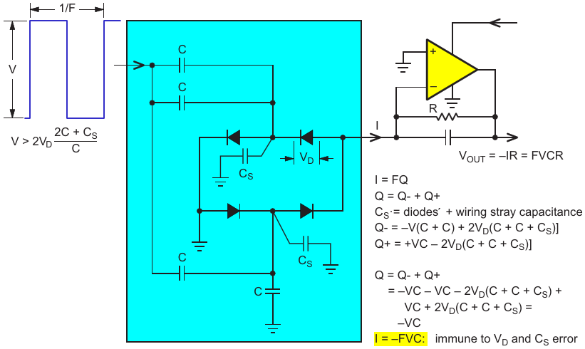 Figure 1. Precision charge pump closes feedback loop to make "crude V→F" accurate from "Designs for High Performance Voltage-to-Frequency Converters"