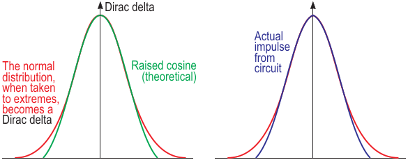 A comparison between an ideal normal-distribution curve and a raised cosine, including the output from Figure 1
