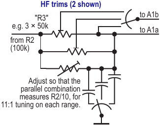 For multi-range use, timing capacitor C1 is switched. To trim the HF response for each range, R3 must also vary