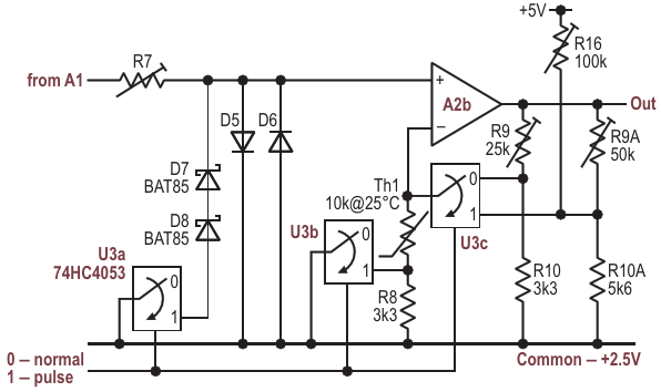 Figure 6. Bridging D6 with a pair of Schottky diodes gives a better fit to the desired curve, though the gain and offset need adjusting