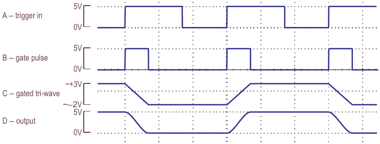 Figure 1. Extra logic added to the original circuit now gives half a cosine on each trigger pulse, with alternating polarities, generating a square wave with smoothed edges