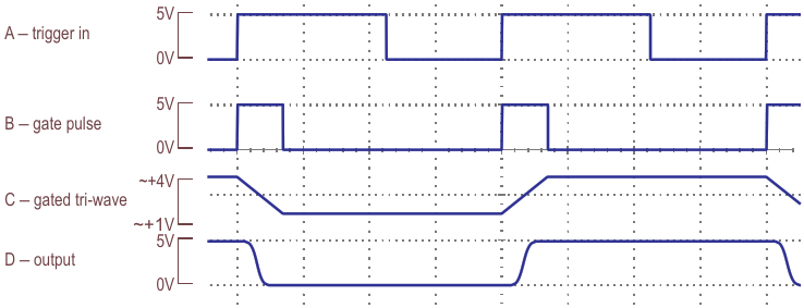 Figure 1. Extra logic added to the original circuit now gives half a cosine on each trigger pulse, with alternating polarities, generating a square wave with smoothed edges