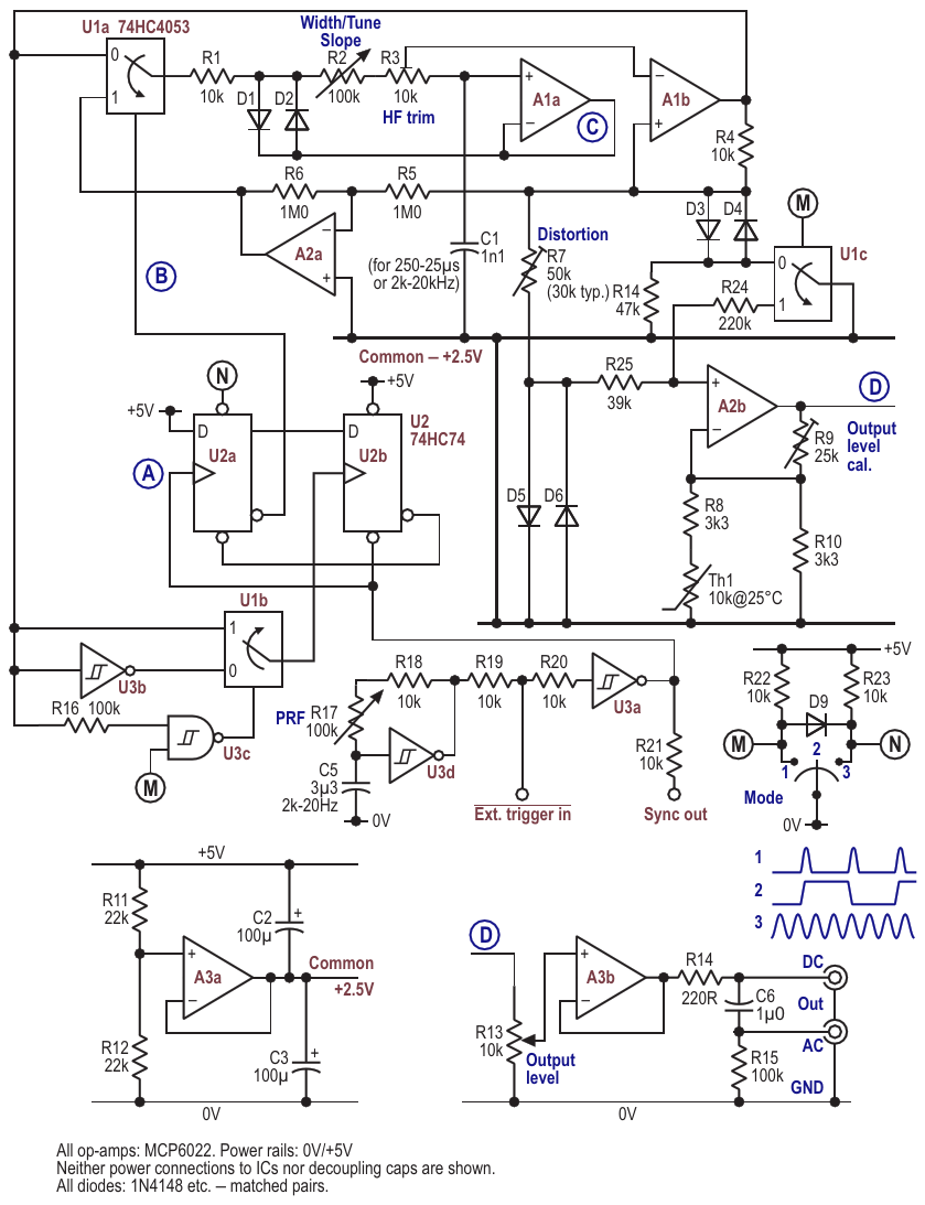 The full circuit, which now produces square waves with well-shaped edges as well as pulses and continuous sine waves