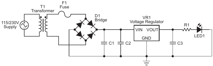 Figure 1. It's not hard to drive an LED indicator from the AC line, but it requires many active and passive components