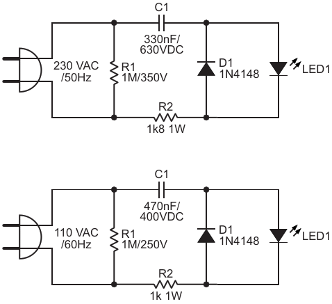 Figure 2. A "capacitor-dropper" circuit can also be used to drive an LED directly from the AC line; despite its apparent simplicity, it's actually a circuit with subtleties and also has some regulatory/safety issues (upper: 230 VAC and lower: 110 VAC)