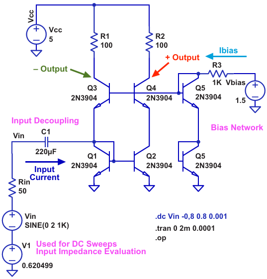 Figure 1. LTspice schematic of the micromixer topology with 6 BJTs arranged such that the output current from Q3 and Q4 are dependent upon input polarity