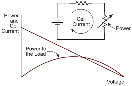 Figure 1. The load voltage versus cell and load current for a circuit where the voltage source is in series with some source resistance feeding power to a variable load