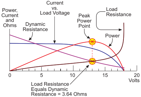 Figure 7. Current, power and dynamic resistance curves for the Solec S-70C PV device. The dynamic resistance of the PV here is no longer the static horizontal line we saw in Figure 3