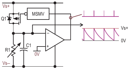 Figure 1. A typical relaxation oscillator with an exponentially decaying sawtooth output, is the starting point for this design