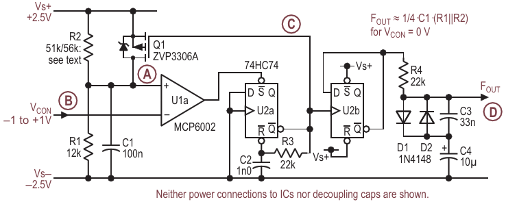 Varying the reference voltage instead of the R-C time-constant gives a tuning law that is close enough to being linear in pitch over a couple of octaves, especially after adding R2