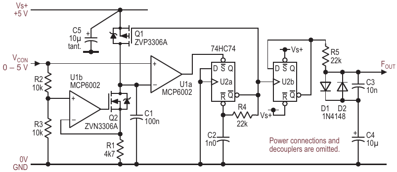 Figure 4. Adding a voltage-controlled current sink in place of tuning resistor R1 is the key to operation over more than 4 octaves with much better pitch accuracy