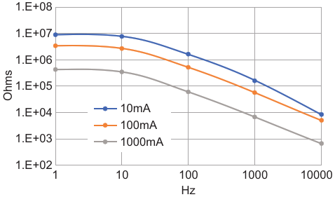 The Impedance in ohms seen by V_LOAD at three different DC currents. Higher impedances are associated with more nearly ideal current sources. The dots on the curves represent simulation measurements