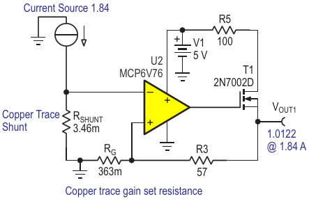 Basic circuit is shown for low-side current sensing with temperature compensated copper PCB trace shunt
