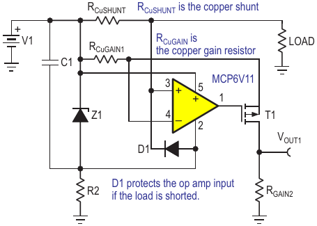 Figure 1. Basic circuit is shown for low-side current sensing with temperature compensated copper PCB trace shunt