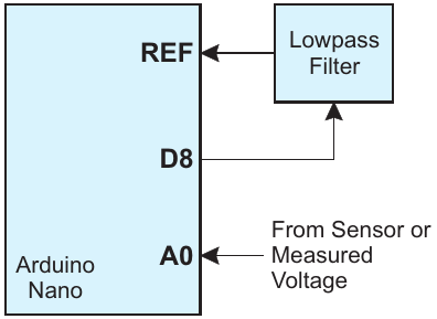 Figure 5. Using the Arduino Nano's PWM output and a lowpass filter to obtain the desired DC signal to use as a voltage reference