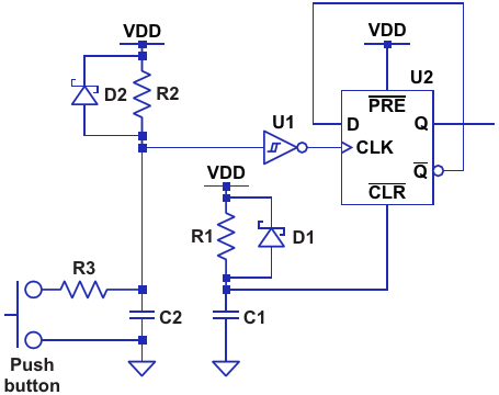 U1 is a Schmitt inverter and U2 a D-type flip-flop. The diodes are small-signal Schottky types. The pushbutton is normally open. See the text for a discussion of resistor and capacitor values