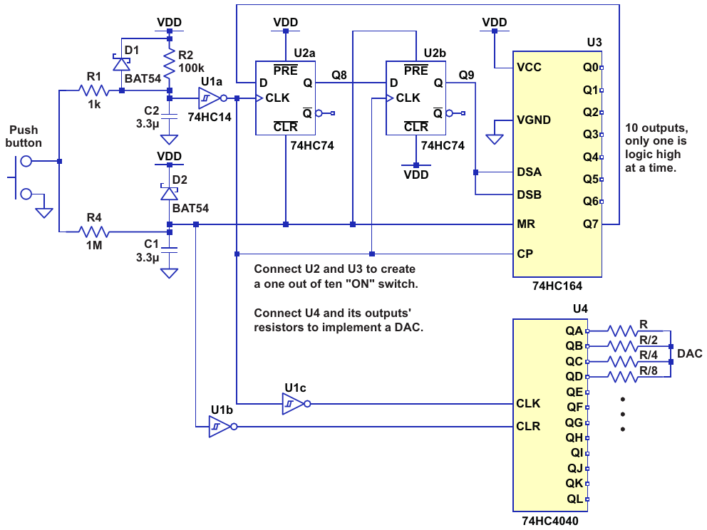 Figure 1. U1 is a Schmitt inverter and U2 a D-type flip-flop. The diodes are small-signal Schottky types. The pushbutton is normally open. See the text for a discussion of resistor and capacitor values