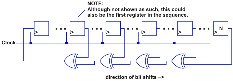 The general form of an MLS generator. A reference lists a table of 2 to 5 specific taps for register lengths from N = 2 to 32 to produce repeating sequences of length 2N-1. Register initialization must include at least one non-zero value. The a