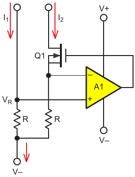 Figure 1. An active current sink mirror. Assuming resistor equality and negligible A1 offset error, A1 feedback forces Q1 to maintain accurate current sink I/O equality I2 = I1