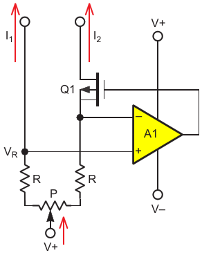 Figure 2. An active current source mirror. This is identical to Figure 1, except this Q1 is a PFET and the polarities are swapped