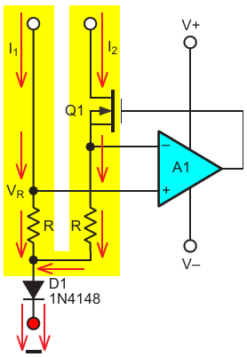 Figure 4. Source/sink two-way mirror with a D1 flipped the opposite direction, and Q1 replaced with a PFET