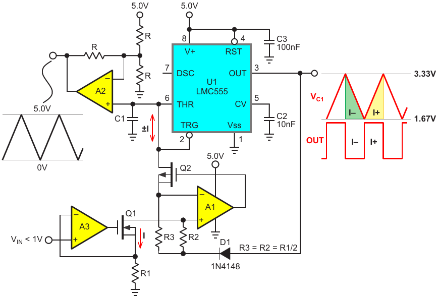 Figure 1. The active two-way current sink/source mirror. The input current source is mirrored as a sink current when D1 is forward biased, and transmitted as a source current when D1 is reverse biased