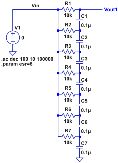 Passive RC circuit using resistors and capacitors of the same value in a ladder network