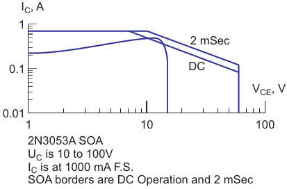 Figure 3. Safe operating area reconstruction of the 2N3053 and 2N3053A SOA chart taken from a very old datasheet from RCA