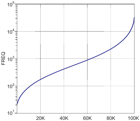 Frequency versus potentiometer resistance curve in a log plot, interpolated over 100 measurement points, showing a flatter curve profile and larger tuning range