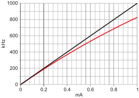 Nonlinear red curve versus ideal black shows ~20% error from LMC555 internal delay. The y-axis is the output frequency. The x-axis is the control current