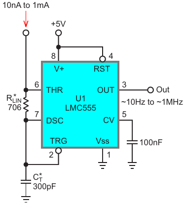 Figure 1. A super simple, 5-decade LMC555 current-controlled oscillator