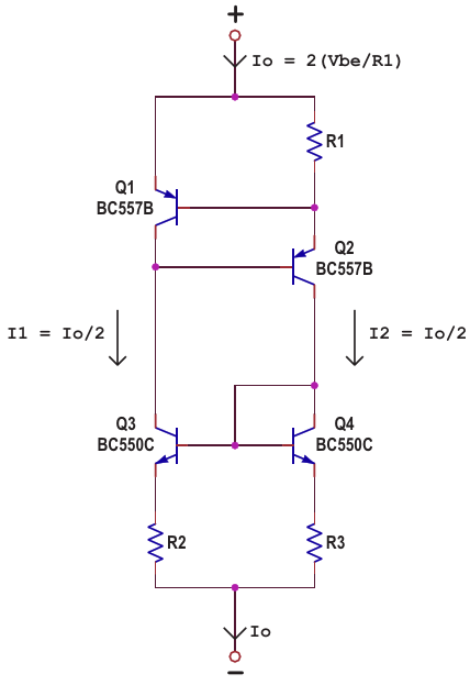 Figure 1. A simple, fully floating LED current driver based on a VBE-referenced current source and a BJT current mirror. The circuit operates as either a current sink or source and supports output currents up to 100 mA. Note: R2 = R3. All resistors are ¼