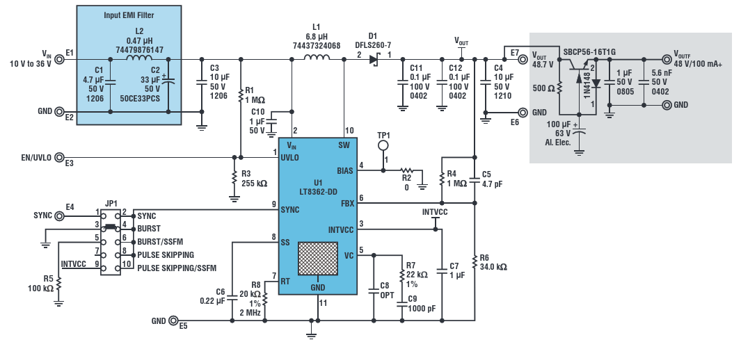 Figure 2. Сircuit with a capacitance multiplier (gray) at the output to suppress audio frequency noise produced by the switching regulator