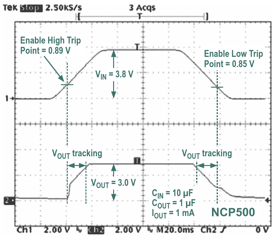 Connecting a low-dropout regulator's enable pin directly to the unregulated voltage input forces the output voltage to track the input voltage during the regulator's turn-on and turn-off intervals