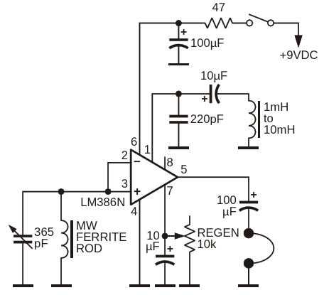 This schematic shows how to use the LM386 as a medium wave regenerative receiver