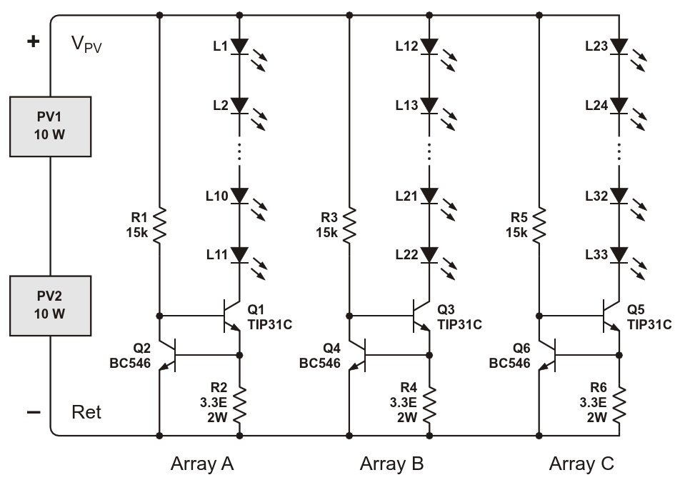 Figure 4. Here is the schematic of a 20 W solar day lamp with active current limiting
