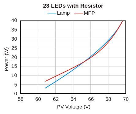 Figure 12. Compare the power output of a lamp with 23 LED arrays to the MPP curve