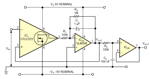 Figure 1. The dual-power-supply-voltage version of this positive peak detector requires only two active devices: a comparator and a dual operational amplifier