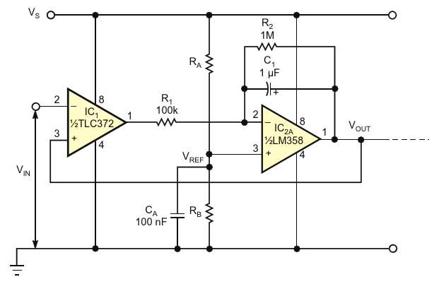For operation from a single power supply, this version of the peak detector sets a reference voltage via resistors RA and RB