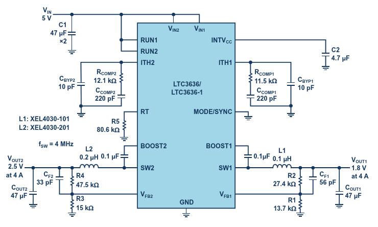 Figure 1. A 4 MHz dual buck regulator delivers a compact solution