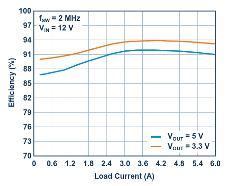 The efficiency curve for VOUT = 5 V and 3.3 V
