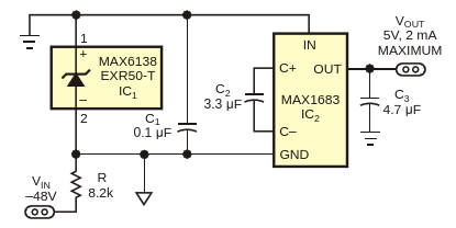 This small, simple circuit produces 5 V at 5 mA from a -48 V input