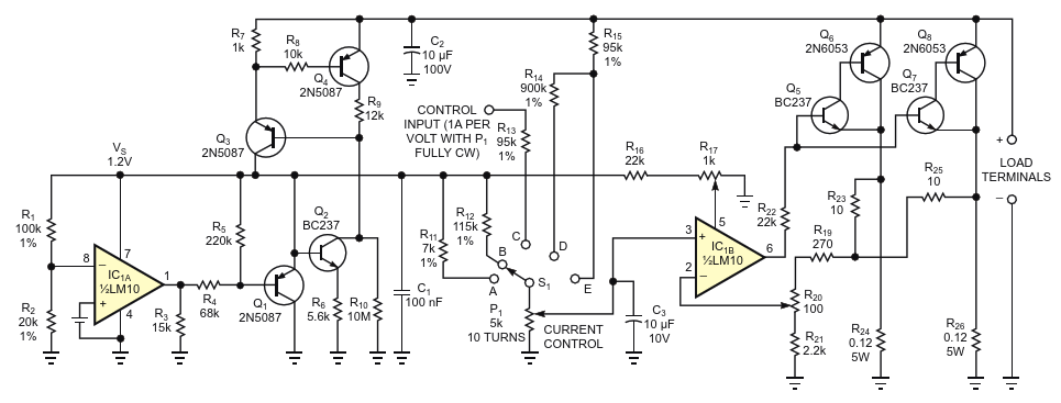 This versatile precision load circuit draws constant current or emulates an adjustable power resistor