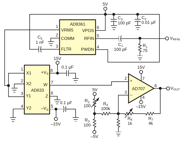 Figure 1. This circuit provides an output voltage that is linearly proportional to the input power in watts