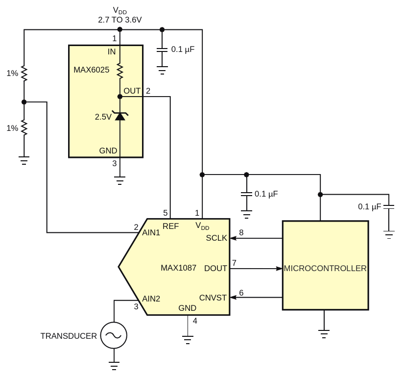 Figure 2. To eliminate the resistive divider, you connect the ADC's reference voltage to its power supply and measure the precision voltage reference's output