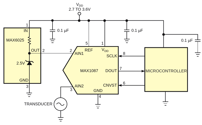 Figure 2. To eliminate the resistive divider, you connect the ADC's reference voltage to its power supply and measure the precision voltage reference's output