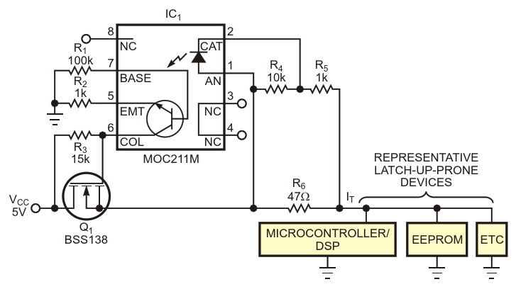 Upon sensing an overcurrent spike, this circuit interrupts power and enables the circuit's recovery from ESD-induced latch-up