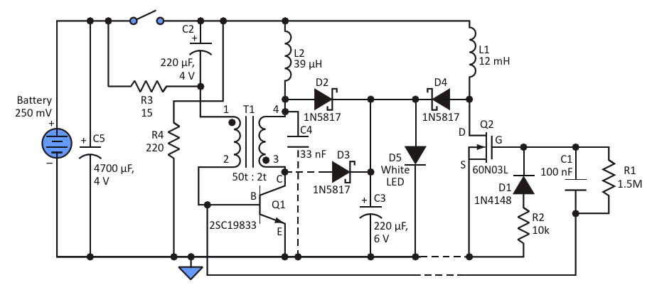 Figure 1. This converter circuit uses a third wire connected upstream of the power switch to «kick-start» operation at less than 250 mV, while using a BJT rather than a JFET or germanium transistor