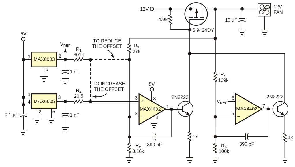 Figure 1. This circuit delivers a continuous and linear fan-control voltage that is proportional to temperature